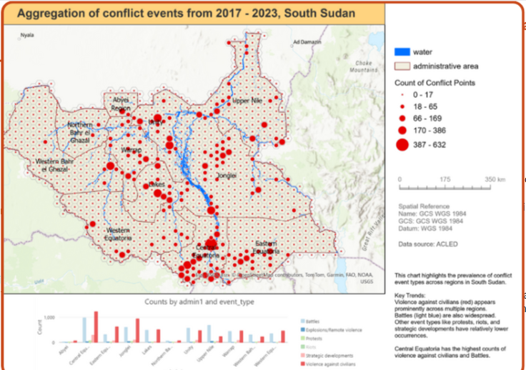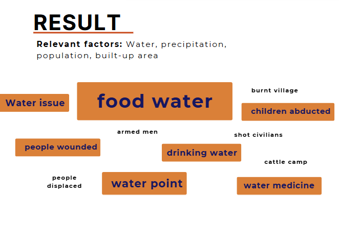 The NLP pipeline (bigrams) revealed key environmental factors relevant to conflicts such as water access, built-up areas, precipitation, and population. By combining conflict event datasets with EO data (Sentinel-2, MODIS, CHIRPS) and ML prediction techniques, we were able to gain a holistic understanding of the conflict situation in our focus area, South Sudan.